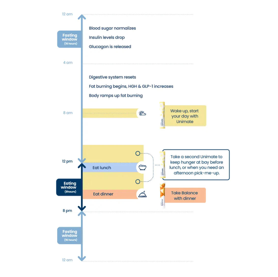 *Improved body compositionSounds great, right? Unimate supports the body’s natural GLP-1 production, which helps you feel full for longer, and Balance adds much-needed fiber to support satiety further. These products work together to help stabilize blood sugar and reduce hunger, making it easier to extend the time between dinner and your first meal of the following day.